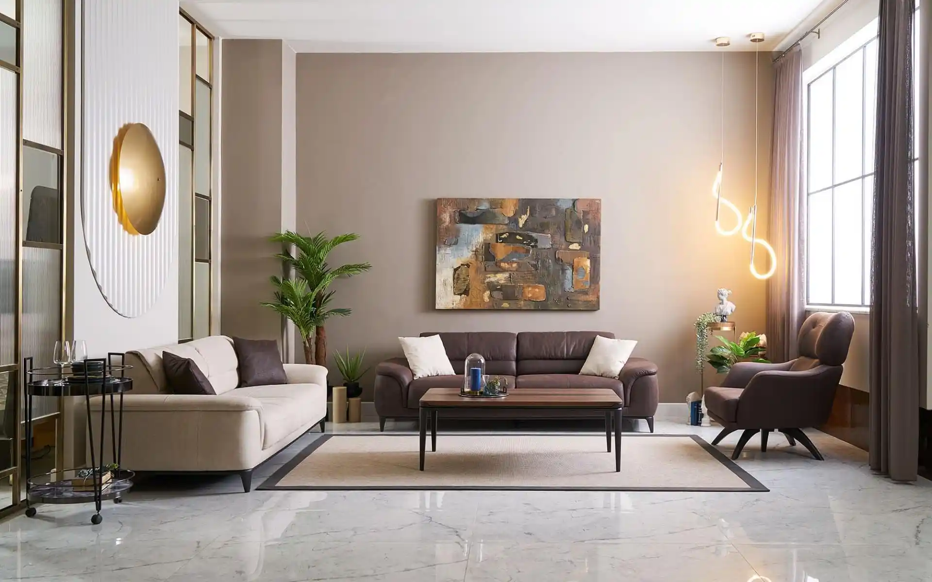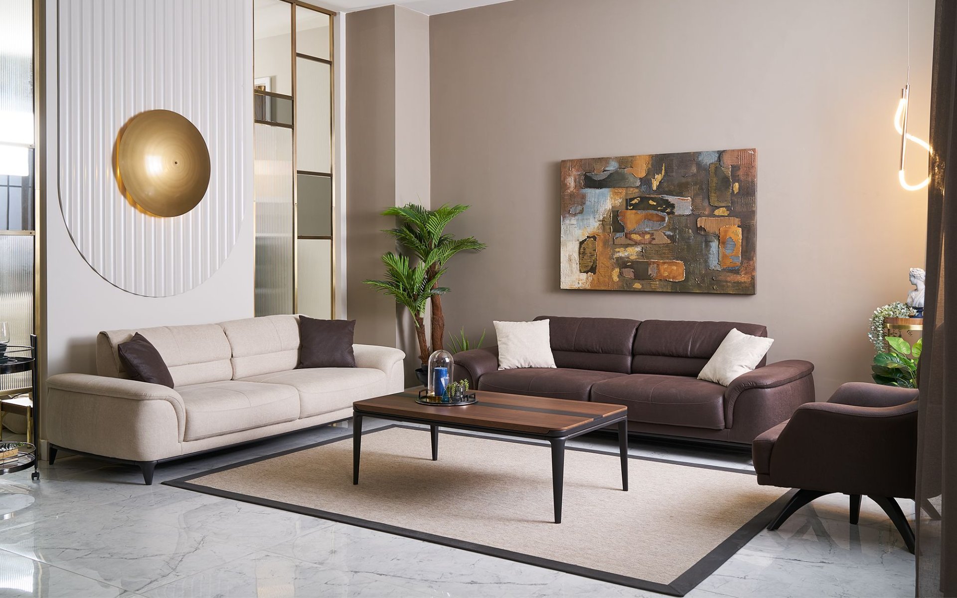 Luxurious milk-colored 3-seater + single seater combo with a premium brown 3-seater. Plush comfort, modern design, perfect for cozy living rooms.